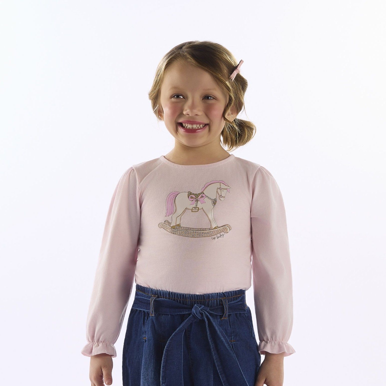 Delicada e cheia de charme, esta blusa infantil feminina em tom rosa é perfeita para compor produções encantadoras. Confeccionada em meia malha de algodão, oferece toque macio e confortável para o dia a dia das pequenas. O destaque fica por conta da estampa de cavalinho com aplicação de strass, que adiciona um brilho sutil e um toque especial à peça. A gola com abertura em botão nas costas facilita na hora de vestir, enquanto as mangas com elástico e babadinho trazem um visual ainda mais gracioso. Versátil e aconchegante, é ideal para criar looks românticos em dias de clima mais ameno, unindo estilo e conforto em uma só peça. Composição: 100% algodão Instruções de lavagem: Lavar em temperatura máxima de 40ºC (processo normal), com cores semelhantes. Não alvejar. Secagem em tambor permitida em baixa temperatura (máx. 60ºC). Passar com ferro em temperatura máxima de 200ºC. Não lavar a seco.