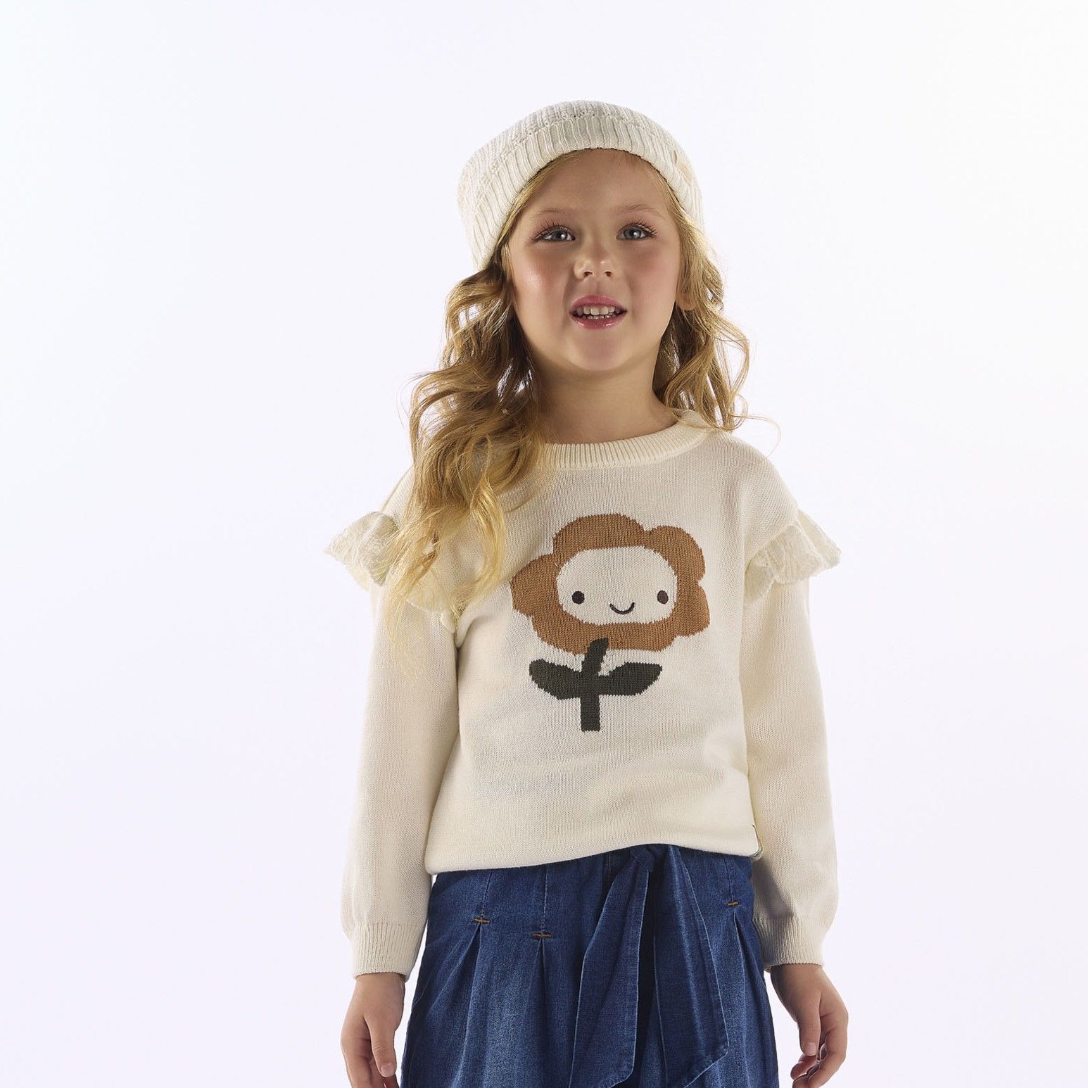 Este blusão de tricô infantil feminino é a escolha ideal para aquecer com charme e delicadeza. Com um toque macio e aconchegante, a peça se destaca pelo bordado frontal de flor sorridente, que traz um ar lúdico e encantador. O detalhe de babado rendado nas mangas adiciona feminilidade e sofisticação ao visual. A gola, os punhos e a barra em acabamento canelado proporcionam um ajuste confortável ao corpo, ajudando a manter o calor nos dias mais frios. Versátil e estiloso, é perfeito para compor looks casuais cheios de personalidade e carinho. Composição: 50% acrílico, 50% algodão Instruções de lavagem: Lavar à mão, com temperatura máxima de 40ºC, separadamente. Não alvejar. Não secar em tambor. Secar na horizontal, por gotejamento, à sombra. Não passar. Não lavar a seco.