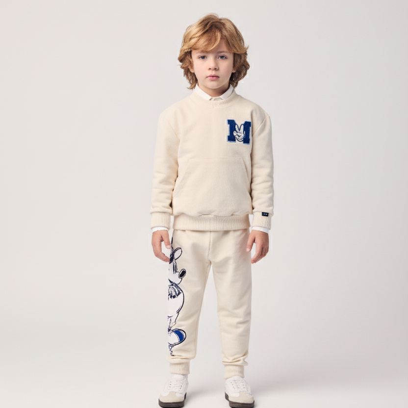 O conjunto infantil de moletom do Mickey traz a combinação perfeita entre conforto e um visual esportivo cheio de personalidade. O blusão em tom claro possui bolso canguru, gola e punhos estruturados, além de um patch “M” com detalhe divertido que agrega estilo à peça. A calça completa o look com uma estampa marcante do Mickey em versão beisebolista, deixando a produção ainda mais alegre e cheia de atitude. Confeccionado em moletom macio, o conjunto garante toque aconchegante, liberdade de movimentos e praticidade para o dia a dia, passeios ou momentos de lazer. Um conjunto versátil e estiloso, ideal para acompanhar os pequenos em todas as ocasiões com muito conforto. Composição: 100% algodão