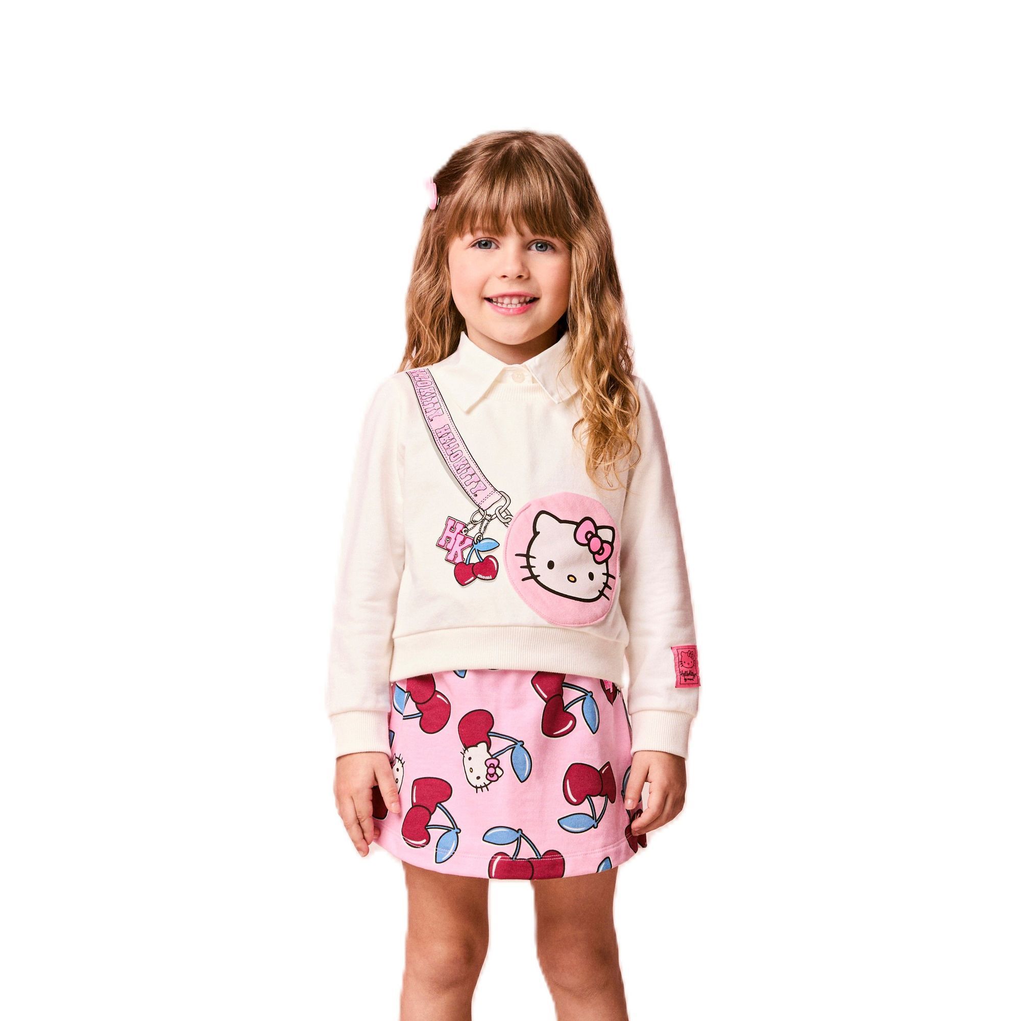 O conjunto infantil em moletom com bolsinha da Hello Kitty é a escolha perfeita para os dias mais fresquinhos, unindo conforto e muito estilo. O blusão apresenta a estampa de bolsinha da personagem aplicada na parte frontal, com alça ilustrada e detalhes encantadores que fazem toda a diferença. O short em tom rosa complementa o look com estampa de cerejinhas e da Hello Kitty, garantindo um visual moderno, delicado e cheio de personalidade para as pequenas. Composição: 100% algodão